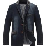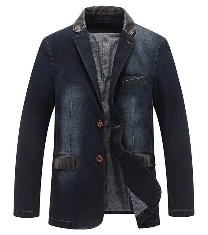 Man’s Sports Notched Collar 2 Button Slim Distressed Denim Blazer Jacket Leather Trim |Dark Blue |S
