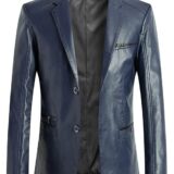 Men’s Casual Notched Collar 2 Button Slim Moto Faux Leather Blazer Suit Jacket Navy Blue