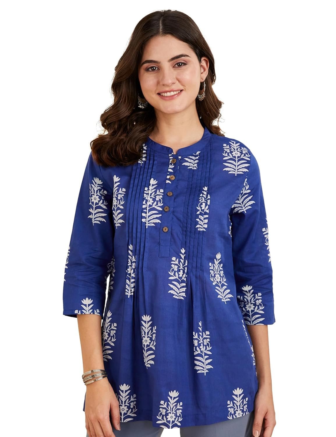 - PRODUCT DETAILS: A-line, screen printed, short kurti featuring pintucks at front yoke, band collar with half placket and 3/4th sleeves.